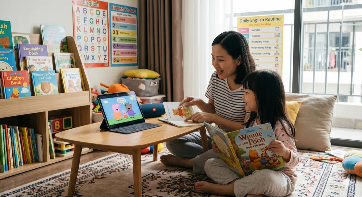 Tuần 1 | Thiết lập "Giờ tiếng Anh" (English Time) 15-30 phút mỗi ngày. | Tạo thói quen tương tác định kỳ. |