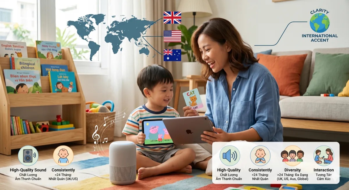 Sự nhất quán (Giai đoạn < 24m) | Ưu tiên một Accent chủ đạo (ví dụ Anh-Mỹ) chiếm ~70% thời lượng. | Giúp trẻ nhận diện từ vựng nhanh hơn bằng cách giảm các biến thể âm thanh gây nhiễu. |