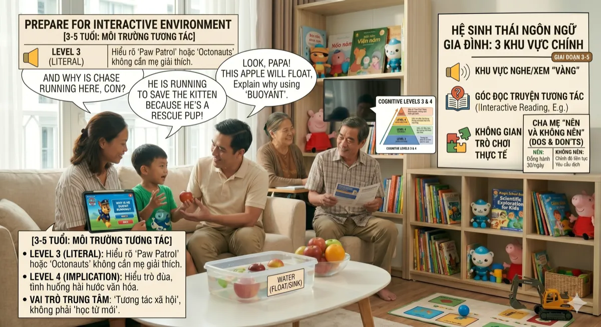 Khi trẻ bước vào độ tuổi từ 3 đến 5, hành trình song ngữ tự nhiên chuyển sang một chương mới. Đây là lúc trẻ không còn chỉ "hấp thụ" thụ động nữa mà bắt đầu có nhu cầu giao tiếp xã hội mạnh mẽ. Vốn từ vựng đã tích lũy trong giai đoạn trước sẽ được trẻ sử dụng để đàm phán, tranh luận và chia sẻ cảm xúc. Đây cũng là thời điểm vàng để trẻ đạt đến cấp độ 3 và 4 trong bảng nhận thức ngôn ngữ.