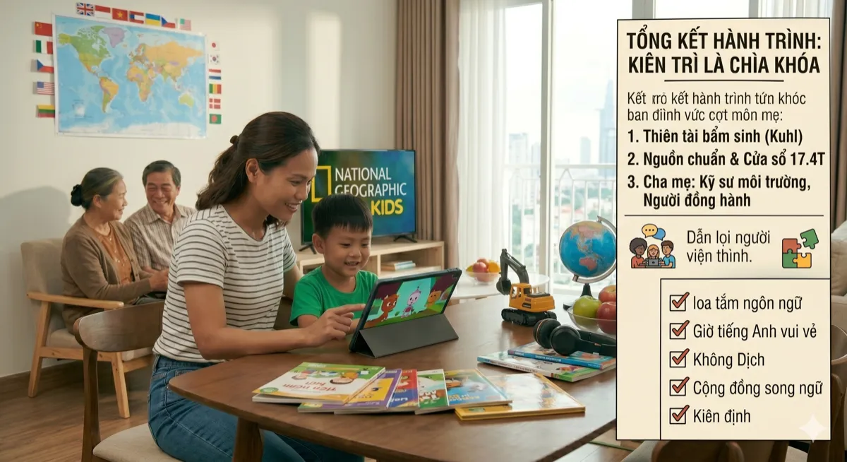 Hành trình "Song ngữ tự nhiên" không phải là một đường thẳng đi lên liên tục. Đó là một con đường với những khúc quanh, những giai đoạn im lặng đầy hoang mang và cả những khoảnh khắc bùng nổ đầy hạnh phúc. Khi bạn đọc đến bài viết cuối cùng này, bạn đã trang bị cho mình đầy đủ những vũ khí sắc bén nhất: từ kiến thức khoa học thần kinh đến những chiến lược thực tế nhất để đồng hành cùng con. Hãy cùng nhìn lại những điểm cốt lõi để duy trì ngọn lửa này trong suốt nhiều năm tới.
